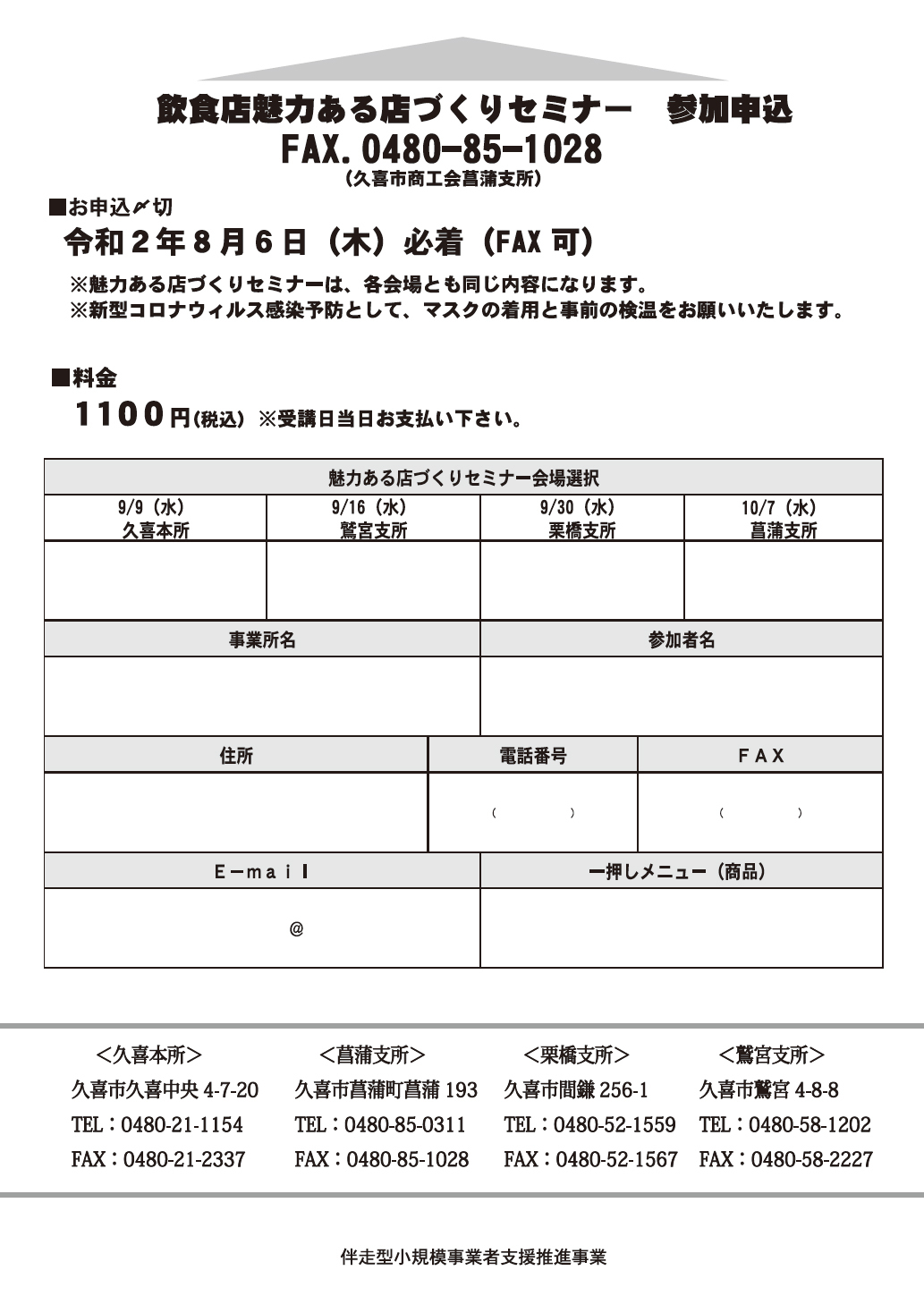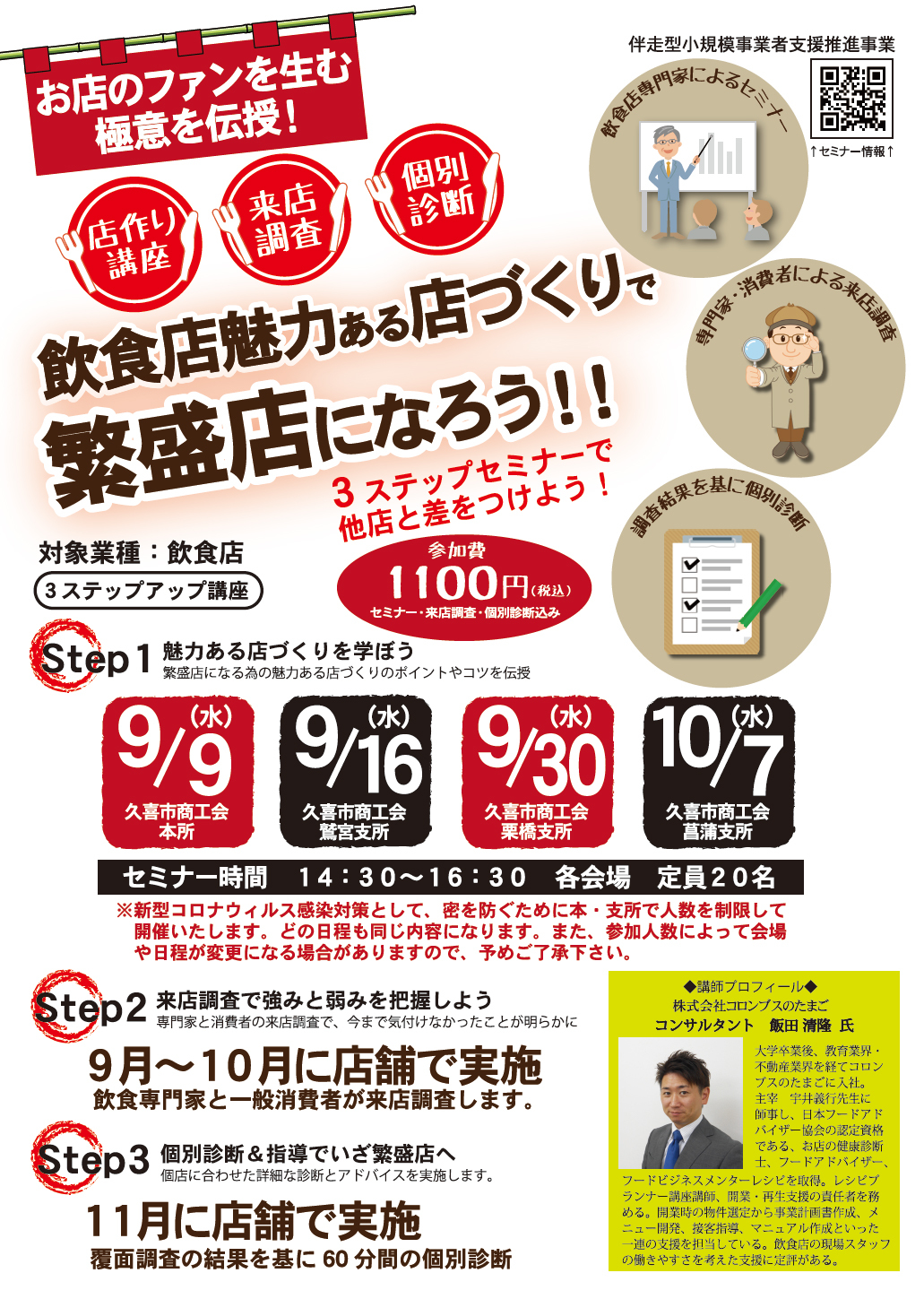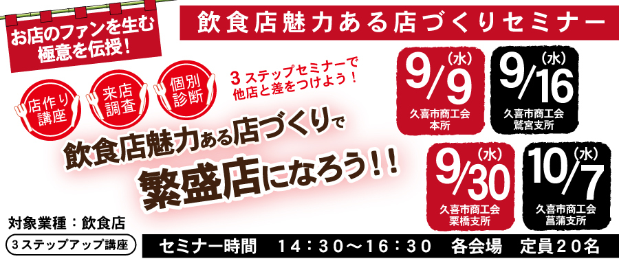 売上が頭打ちになって伸び悩んでいる、顧客が離れていってしまって売上が低迷していると感じている飲食店向けに、魅力のある店づくりセミナーを新型コロナウイルス感染防止策を考慮し4会場で開催いたします。