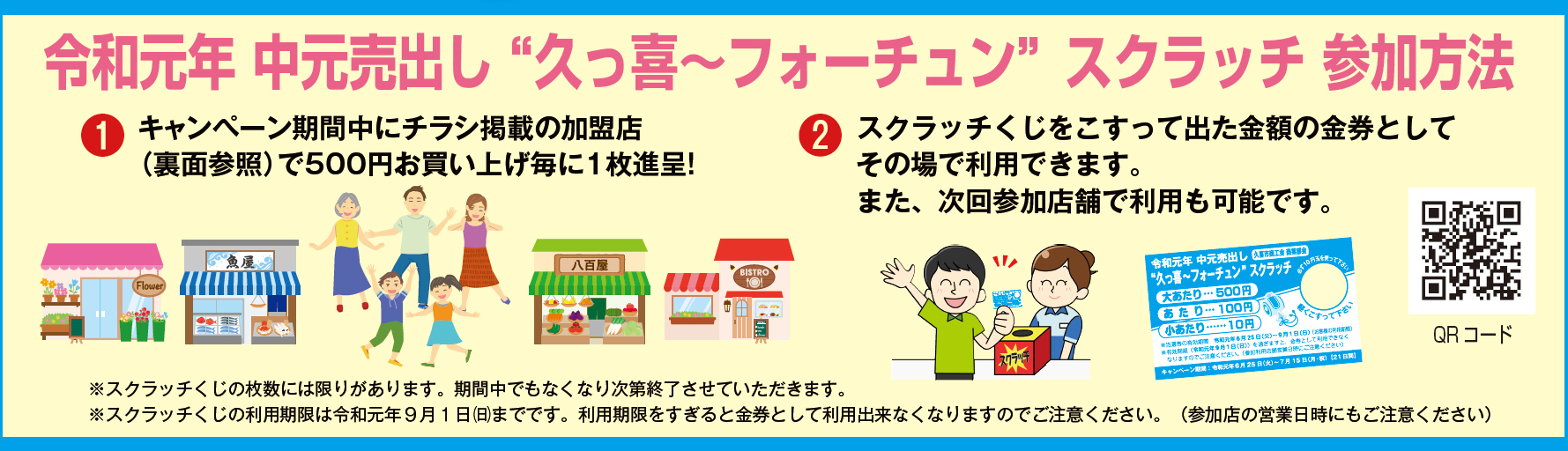 久喜市商工会商業部会では、2020年の夏の感謝セールとして、スクラッチ形式のくじ『コロナに負けるな!夏の感謝セール"久っ喜~フォーチュン"スクラッチ』を実施します。久喜市内150店舗以上の参加店(ページ内掲載)でご利用いただけます。(参加店にて500円のお買い上げ毎に、抽選箱の中にあるスクラッチを1枚引いていただきます。当たったスクラッチは金券として参加店で利用できます。)
