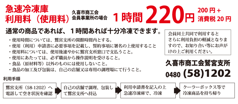 久喜市商工会では、会員の皆様の販路を拡大させるべく、冷凍自販機を設置し、衛生管理が徹底された調理施設で製造又は加工された商品(食品)を販売することにより、消費者の信頼と事業者の売上向上を支援することにより、商工業の振興に寄与いたします。
