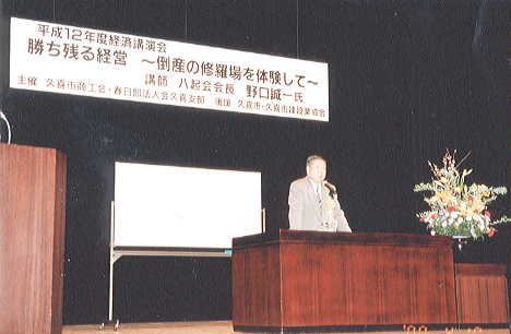 野口氏によりますと、倒産を防ぐには@事業の大きさを自分の能力内にするA同じ失敗をしないB家族や社員への愛情を持つC素直にプラス思考でD選択眼(将来を読む目)を養うE社会に還元するF消費しない等、との事でした。氏の経験に裏打ちされたお話に、熱心にメモを取る聴衆は少なくありませんでした。