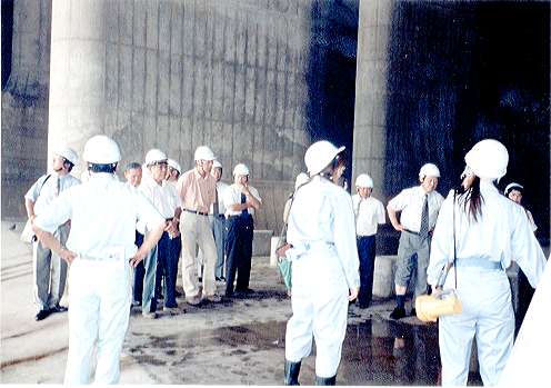 | ▲地下50mの現場(首都圏外郭放水路)で説明を受ける一行。巨大プロジェクトに圧倒される。 |