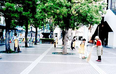 | ▲久喜駅西口の早朝清掃に汗を流す商工会女性部員 |