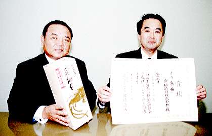▲賞状を手にした寒梅酒造鰍フ鈴木逸郎社長(右)と受賞対象の製品を手にする千葉商工会長(左)