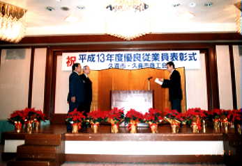 | 11月21日(水)、平成13年度の優良従業員表彰が、ニュー八雲で開催されました。 久喜市長・商工会長連名の表彰状が、ご来賓、事業主の方々が見守るなか、1人ひとりの方々に手渡されました。 表彰式の後、従業員の方々の永年の労をねぎらうささやかなパーティーが催され、一転和やかな雰囲気に包まれました。 |