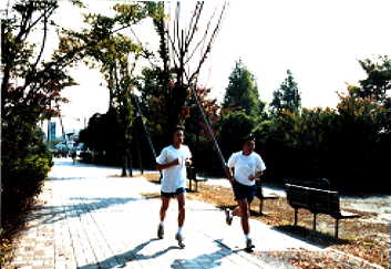 | ▼香取公園遊歩道をランニングする高校生 |