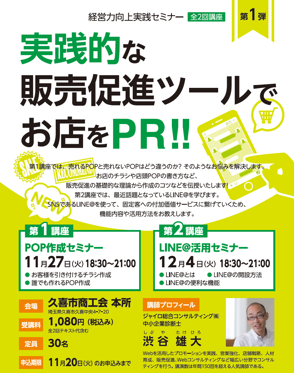 第1講座では、売れるPOPと売れないPOPはどう違うのか?そのようなお悩みを解決します。お店のチラシや店頭POPの書き方など、販売促進の基礎的な理論から作成のコツなどを伝授いたします!