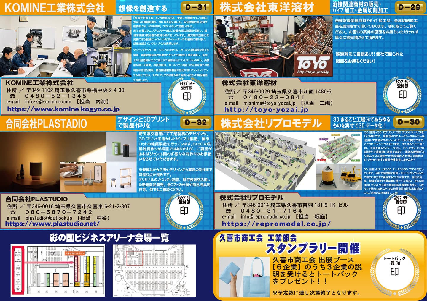 令和7年11月18日(火)・19日(水)にさいたまスーパーアリーナにて行われた彩の国ビジネスアリーナへ、㈱ウェルディングアロイズ・ジャパン・KOMINE工業㈱・㈱東洋溶材・長島鋳物㈱・(合)PLASTUDIO・㈱リプロモデル、久喜市内の6事業所と出店を行いました。