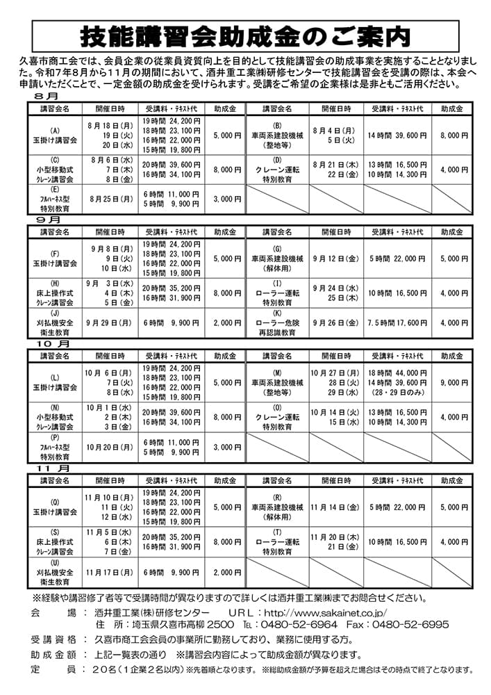 会員企業の従業員資質向上を目的とした技能講習会の助成事業。令和7年8月から11月の期間において、酒井重工業㈱研修センターで技能講習会を受講の際は、本会へ申請いただくことで、一定金額の助成金を受けられます。受講をご希望の企業様は是非ともご活用ください。