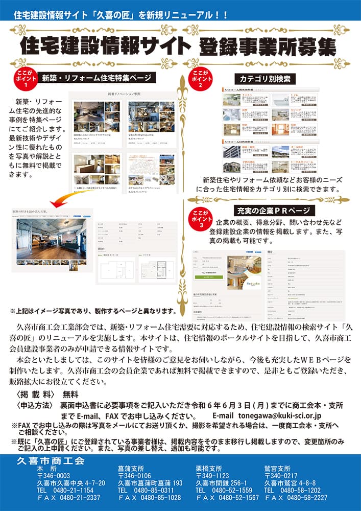 新築・リフォーム住宅需要に対応するため、住宅建設情報の検索サイト「久喜の匠」のリニューアルを実施しました。本サイトは、住宅情報のポータルサイトを目指して、久喜市商工会員建設事業者のみが申請できる情報サイト。