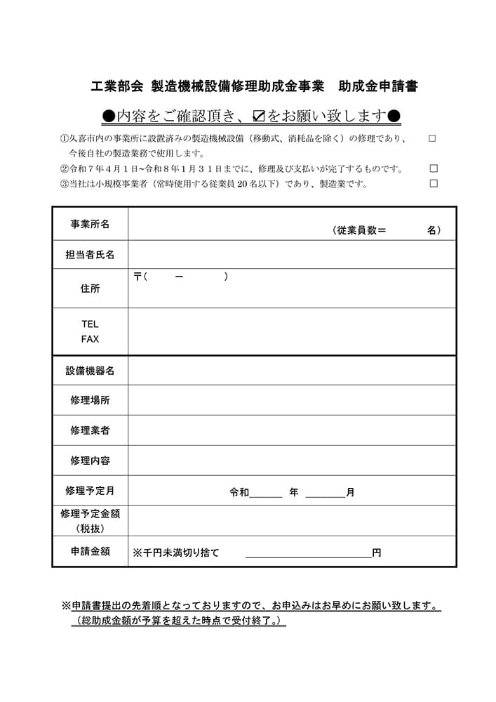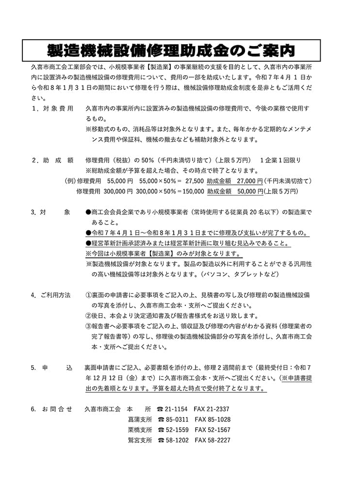 小規模事業者【製造業】の事業継続の支援を目的として、久喜市内の事業所内に設置済みの製造機械設備の修理費用について、費用の一部を助成。令和7年4月1日から令和8年1月31日の期間において修理を行う際は、機械設備修理助成金制度を是非ともご活用ください。