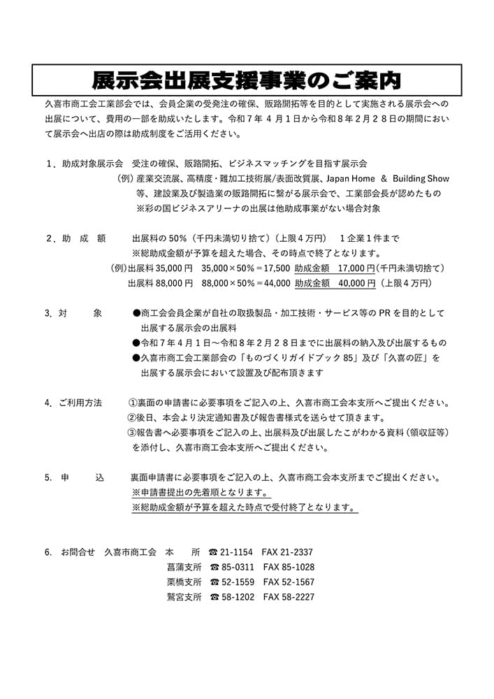 3.対象 ●商工会会員企業が自社の取扱製品・加工技術・サービス等のPRを目的として出展する展示会の出展料