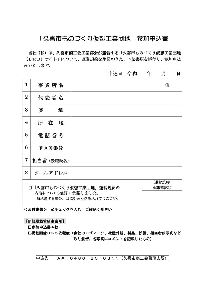 ※既に「久喜の匠」にご登録されている事業者様は、掲載内容をそのまま移行し掲載しますので、変更箇所のみご記入の上申請ください。また、写真の差し替え、追加も可能です。