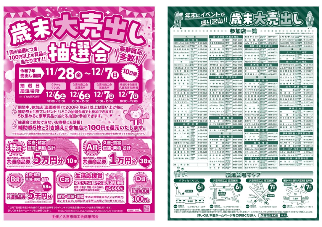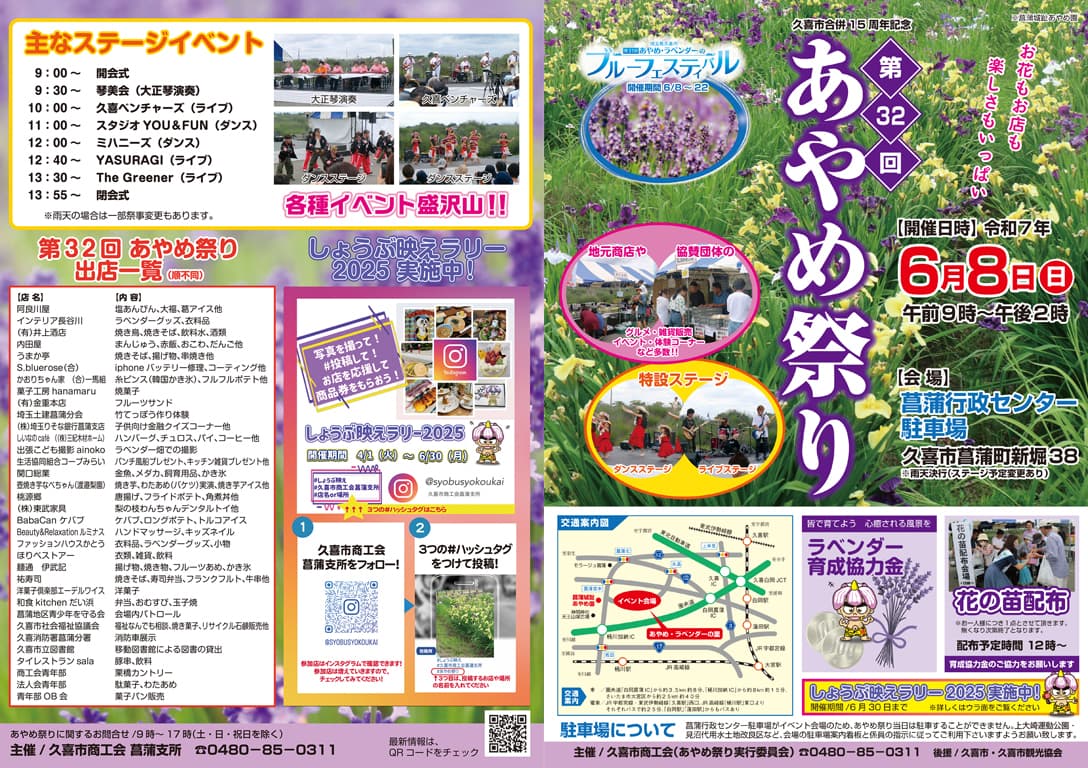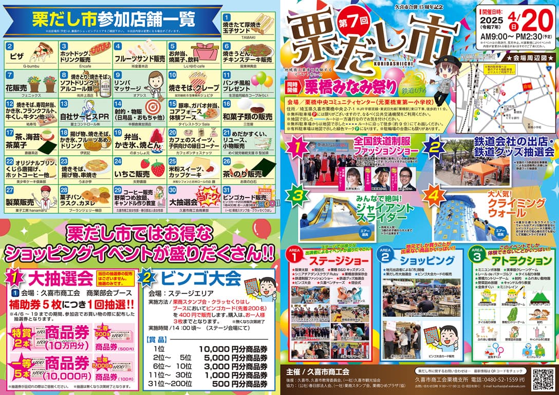 各地区のイベントを紹介します。 各地区のイベントを紹介します。 2025.11.28~12.7 歳末大売出し 2025.11.16 栗橋やさしさときめき祭り(商工まつり) 2025.11.3 産業祭 2025.10.26 コスモスフェスタ 2025.10.19 くきストリートフェスティバル 2025.7.19~20 くりはし夏祭り(園児みこし) 2025.7.13 菖蒲夏祭り(あきんど夜市) 2025.6.8 あやめ祭り 2025.5.25 久喜フレンドシップデー 2025.5.5 サクラダファシミア 2025.4.25 栗だし市