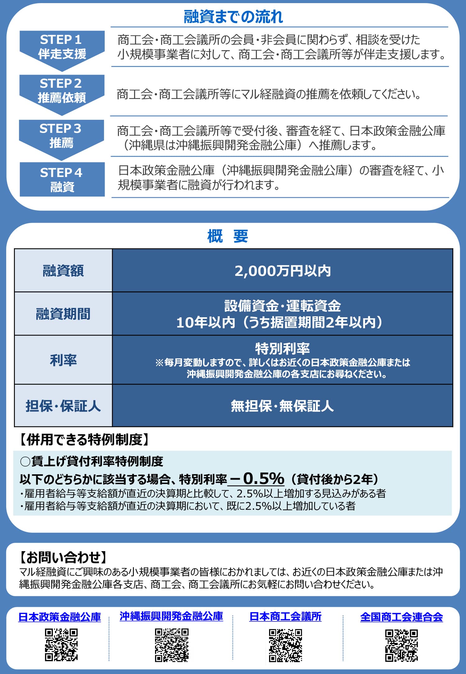 特に、事業資金を商工会の推薦により、 日本政策金融公庫が無担保・無保証・低利で融資する「マル経資金融資」は、多くの小規模企業のみなさまに利用されています。