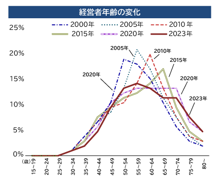 中小企業の経営者の高齢化が進んでおり、経営者年齢のピークはこの20年間で50代から60代~70代へと大きく上昇しています。