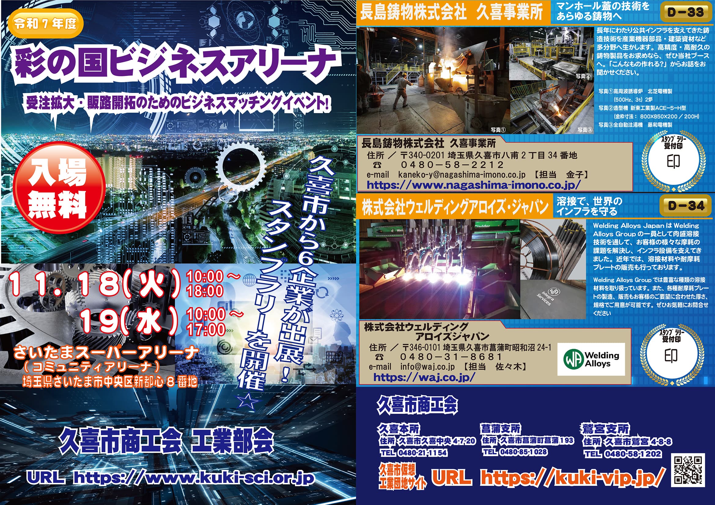 令和7年11月18日(火)・19日(水)にさいたまスーパーアリーナにて行われた彩の国ビジネスアリーナへ、㈱ウェルディングアロイズ・ジャパン・KOMINE工業㈱・㈱東洋溶材・長島鋳物㈱・(合)PLASTUDIO・㈱リプロモデル、久喜市内の6事業所と出店を行いました。