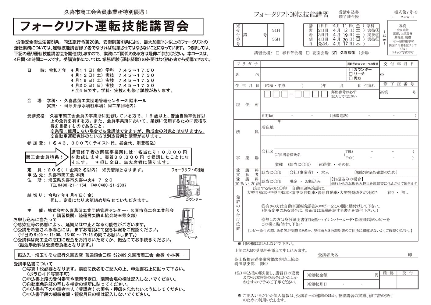 受講資格:久喜市商工会会員の事業所に勤務している方で、18歳以上、普通自動車免許以上の免許を有する方。