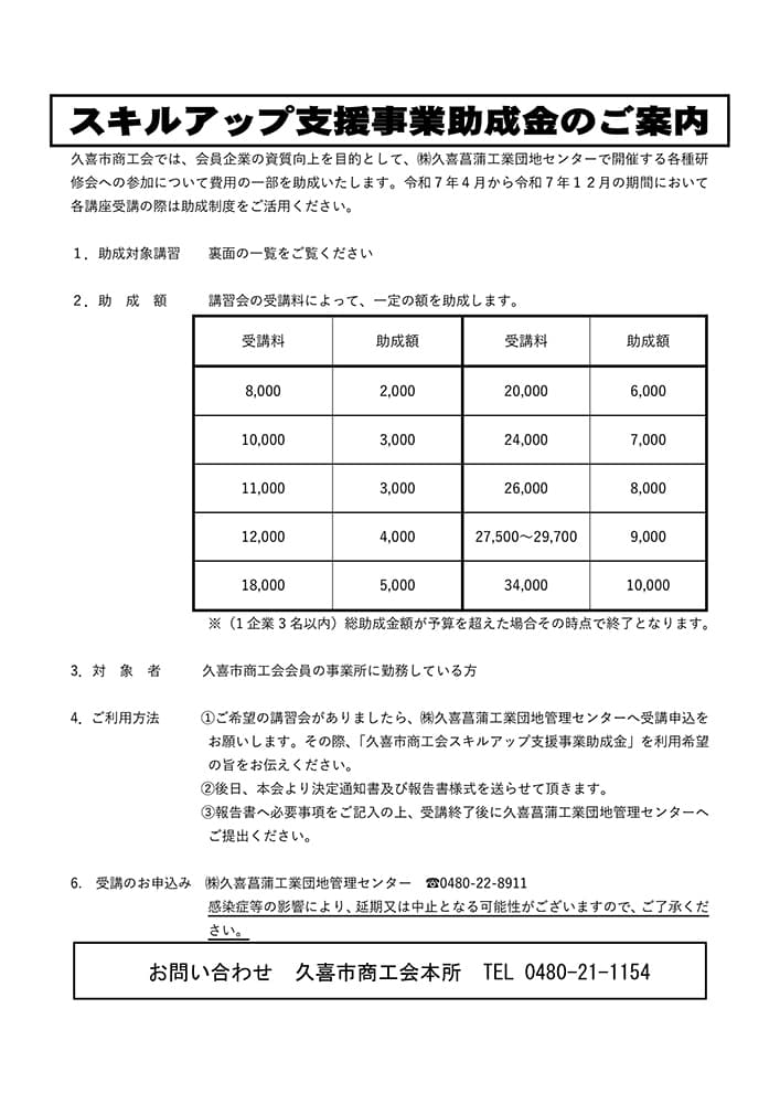 会員企業の資質向上を目的として、㈱久喜菖蒲工業団地センターで開催する各種研修会への参加について費用の一部を助成。令和7年4月から令和7年12月の期間において各講座受講の際は助成制度をご活用ください。
