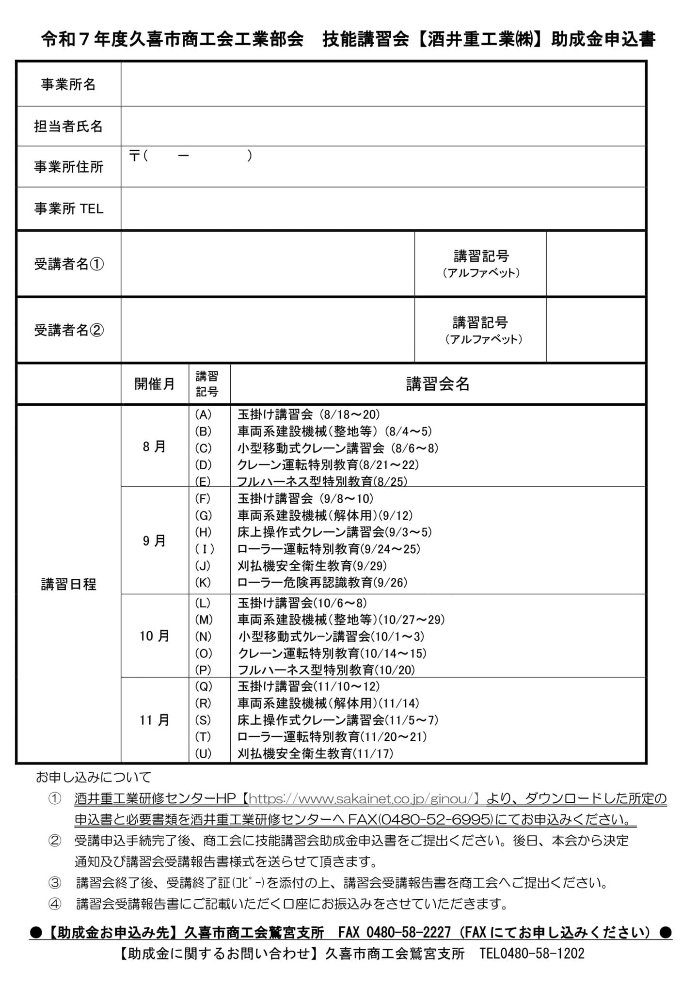 会員企業の従業員資質向上を目的とした技能講習会の助成事業。令和7年8月から11月の期間において、酒井重工業㈱研修センターで技能講習会を受講の際は、本会へ申請いただくことで、一定金額の助成金を受けられます。受講をご希望の企業様は是非ともご活用ください。
