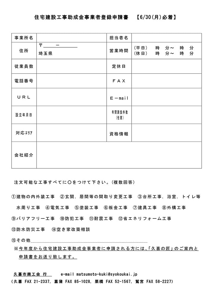 以上のリフォームなど追加した工事を行った際、久喜市商工会に登録した加盟店