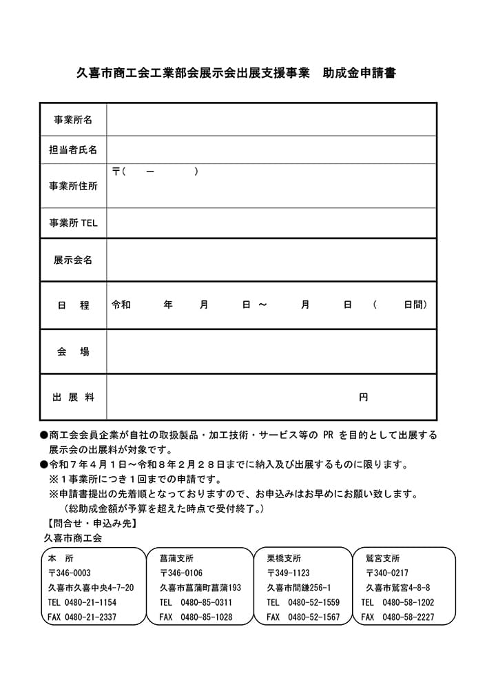 3.対象 ●商工会会員企業が自社の取扱製品・加工技術・サービス等のPRを目的として出展する展示会の出展料