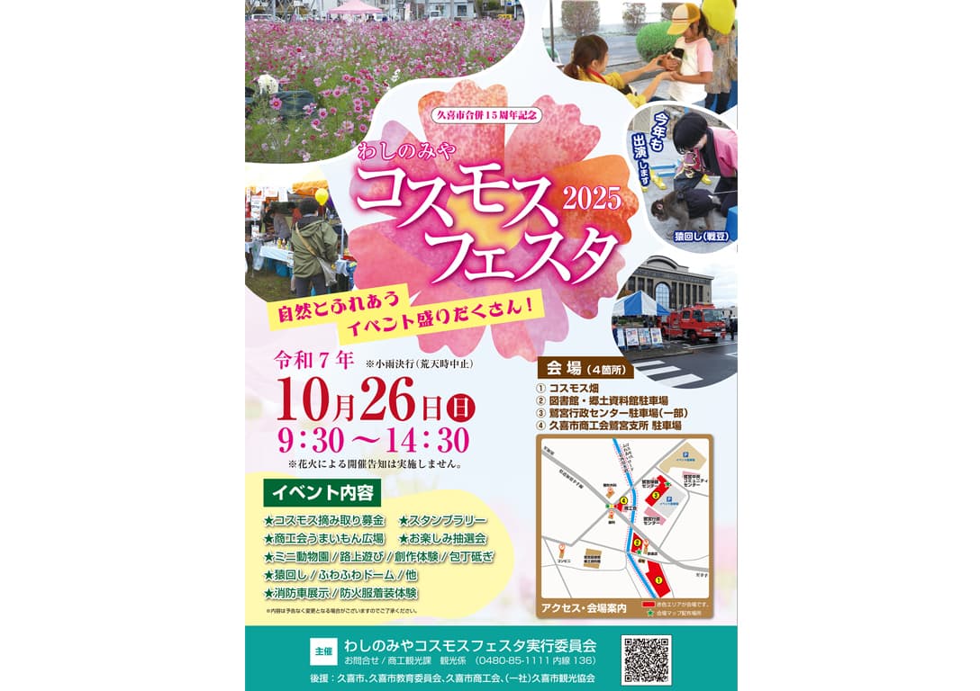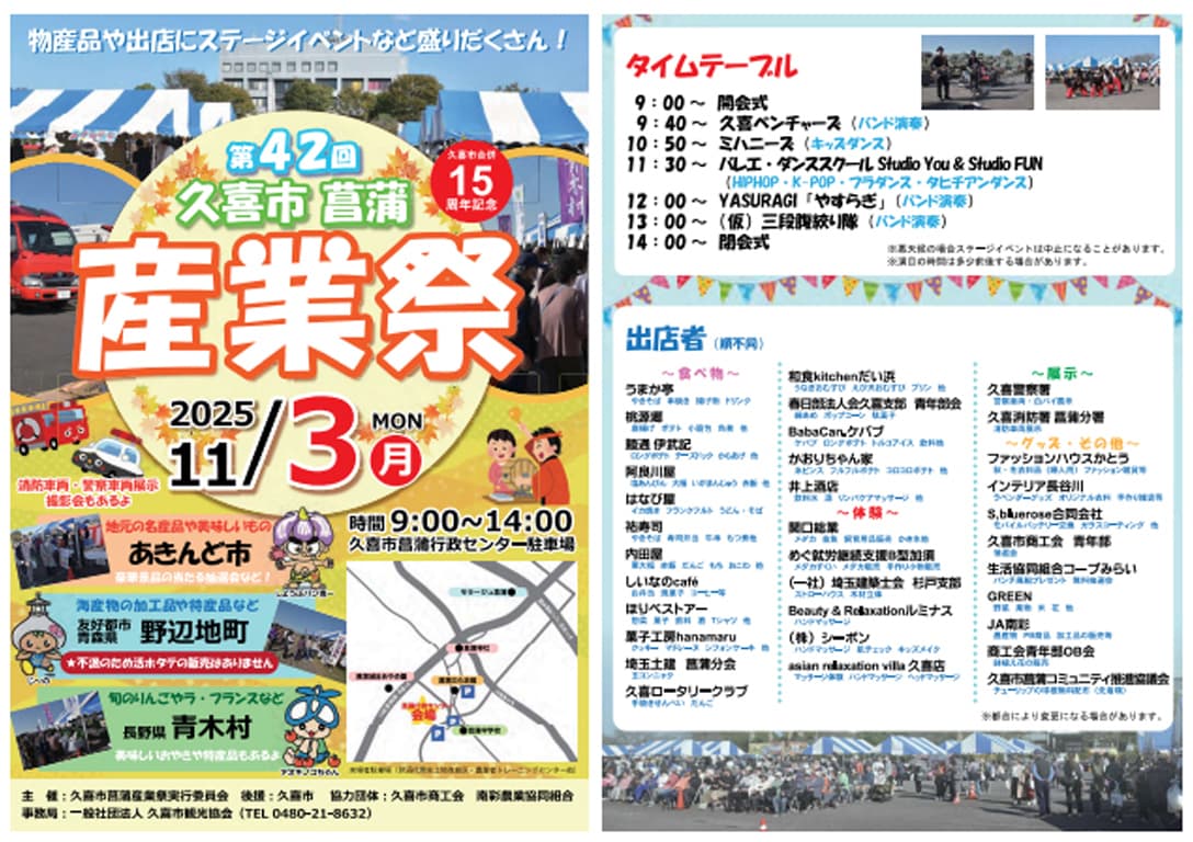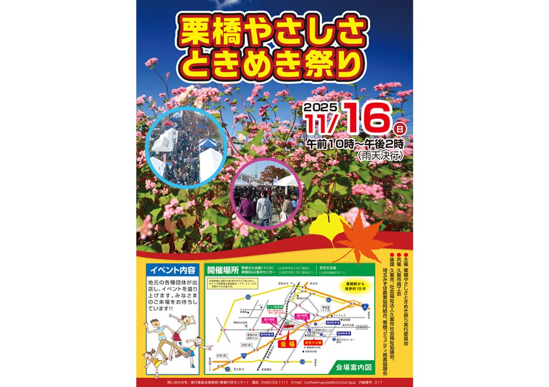 各地区のイベントを紹介します。 各地区のイベントを紹介します。 2025.11.28~12.7 歳末大売出し 2025.11.16 栗橋やさしさときめき祭り(商工まつり) 2025.11.3 産業祭 2025.10.26 コスモスフェスタ 2025.10.19 くきストリートフェスティバル 2025.7.19~20 くりはし夏祭り(園児みこし) 2025.7.13 菖蒲夏祭り(あきんど夜市) 2025.6.8 あやめ祭り 2025.5.25 久喜フレンドシップデー 2025.5.5 サクラダファシミア 2025.4.25 栗だし市